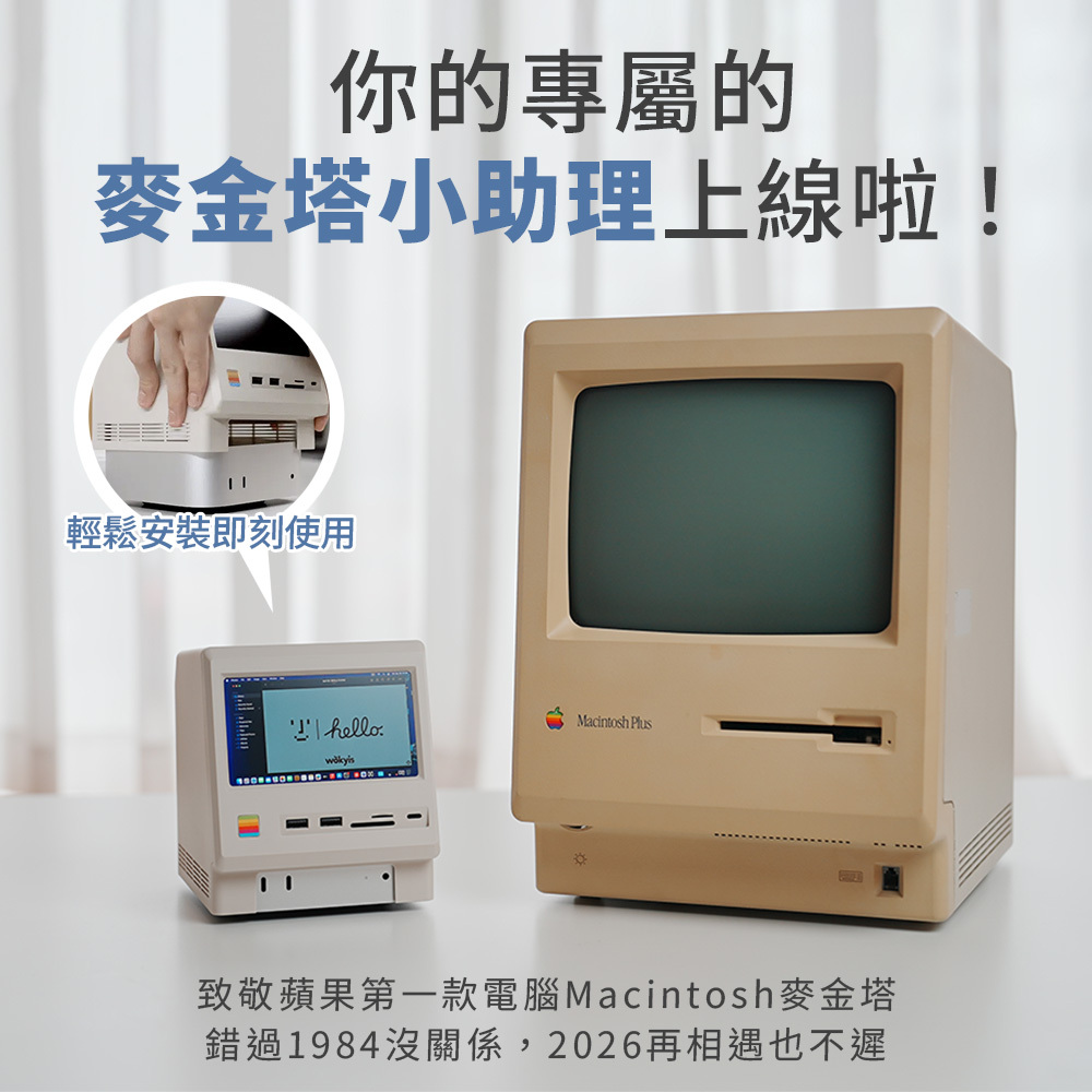米白機身+前傾螢幕,致敬1984年Apple的第一款電腦 Macintosh 麥金塔。外面復古,但裏面強大。